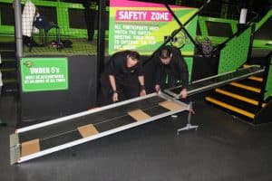 Since the installation of the modular ramping, one local group with disabled members, regularly book out the entire arena. The easy-to-set-up ramping facility has improved accessibility for wheelchair-bound customers, as well as for customers with buggies and people who use compact mobility scooters. There is a small step at the top of the ramp however staff will assist customers to get onto the arena. When not in use, the portable modular ramping is stored in a small room. Now, all customers can access the trampoline arena, whether as users or spectators.